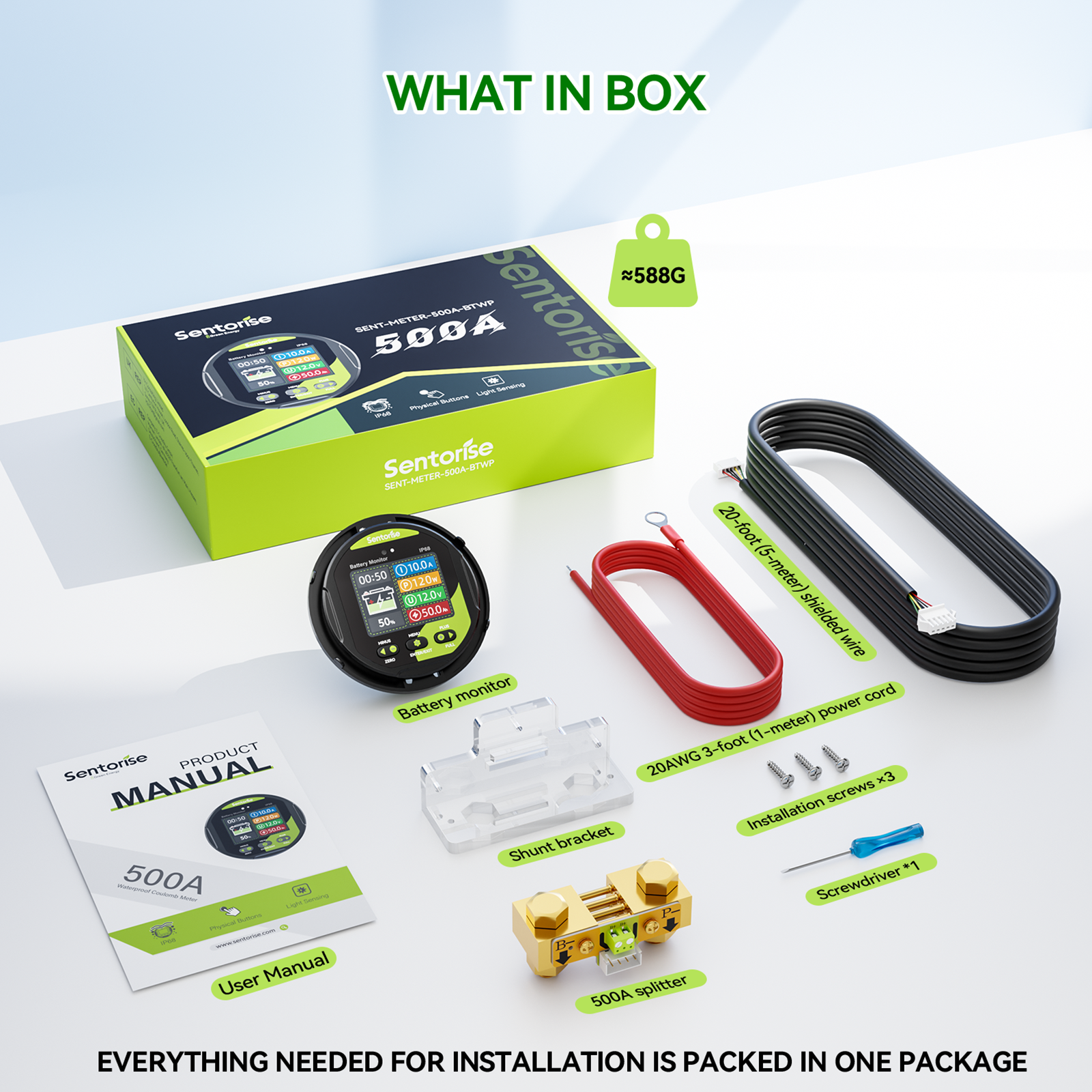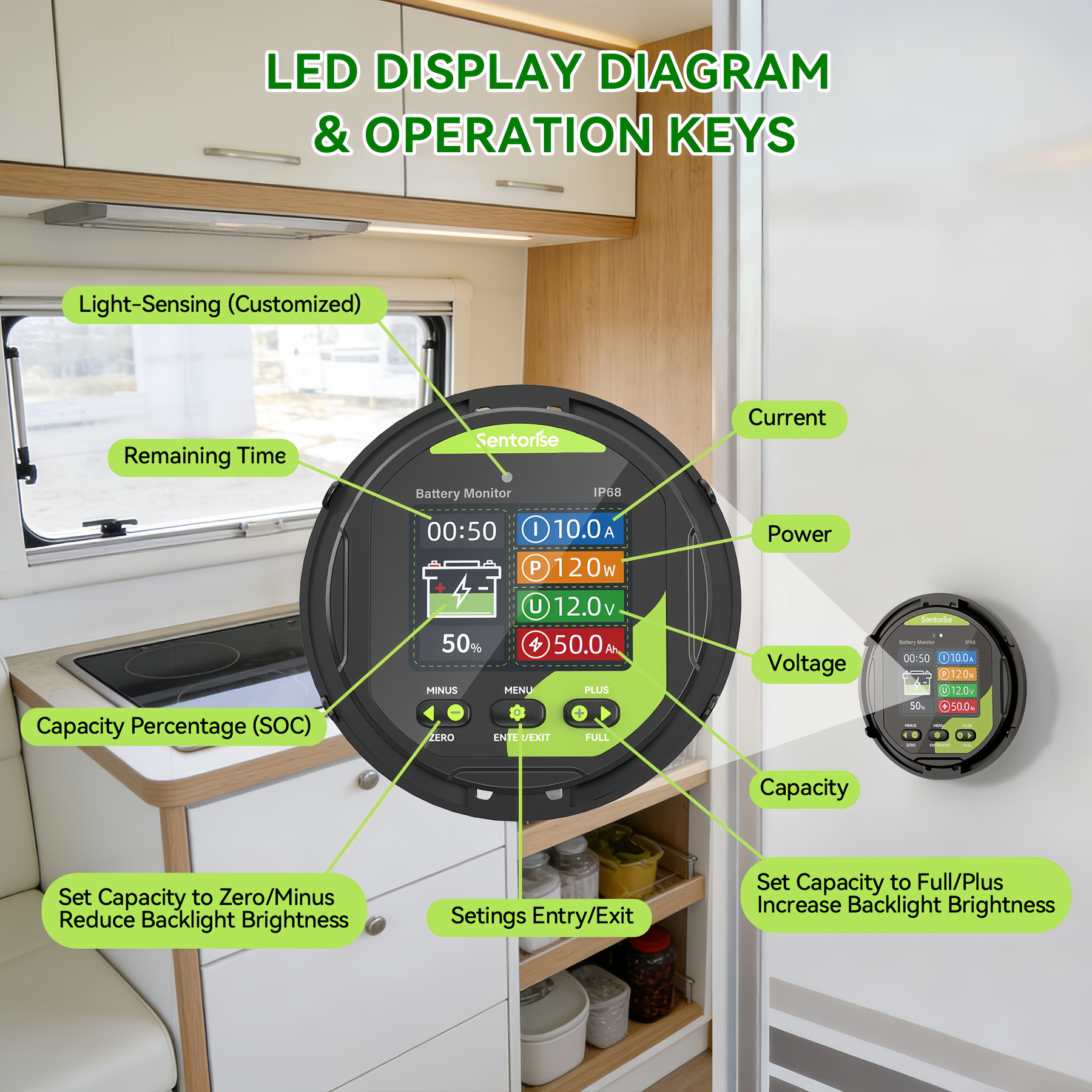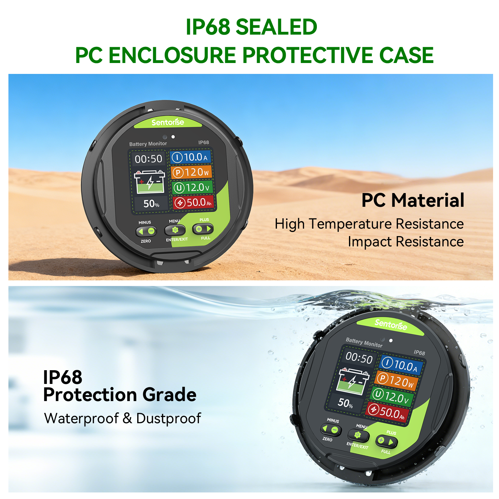 Der Sentorise 500A Batteriemonitor trägt die IP68-Schutzklasse und ist damit für den dauerhaften Außeneinsatz in Wohnmobilen, Booten und Off-Grid-Installationen ausgelegt.